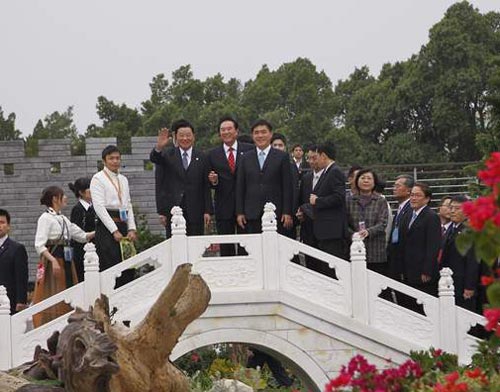 陈云林等一行人离台前参观台北花博,花博9点开园,陈云林参观时间特地提早一个小时,8点多就到花博园区,陈云林先逛圆山园区争艳馆,再到大陆参展的西安庭园及上海豫园,陈云林与海基会长江炳坤、台北市长郝龙斌还特地在上海庭园的造桥上拍照留恋,接着参观流行馆及花博最热门的梦想馆。