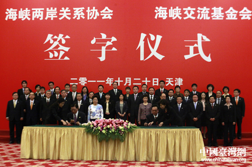 海协会会长陈云林与台湾海基董事长江丙坤20日下午2点30分在天津签署了《海峡两岸核电安全合作协议》。(中国台湾网 陈佳慧 摄)