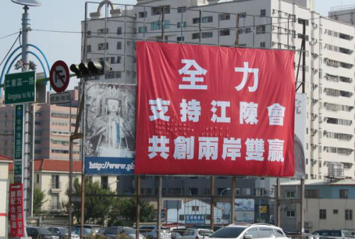 陈云林下榻的饭店前方路口,看到支持江陈会的看板。