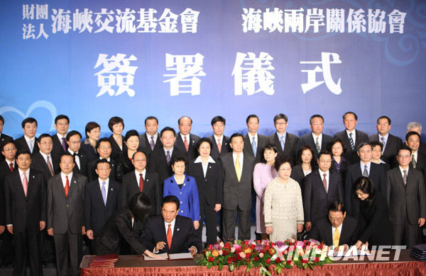 12月22日,海协会会长陈云林与海基会董事长江丙坤在台中签署两岸渔船船员劳务合作、两岸农产品检疫检验合作、两岸标准计量检验认证合作等三项协议。新华社记者 袁满摄
