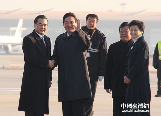 中共中央台办、国台办主任王毅到首都机场为海协会协商代表团送行,图为王毅(左)与海协会会长陈云林握手道别。(中国台湾网 钟宝华 摄)