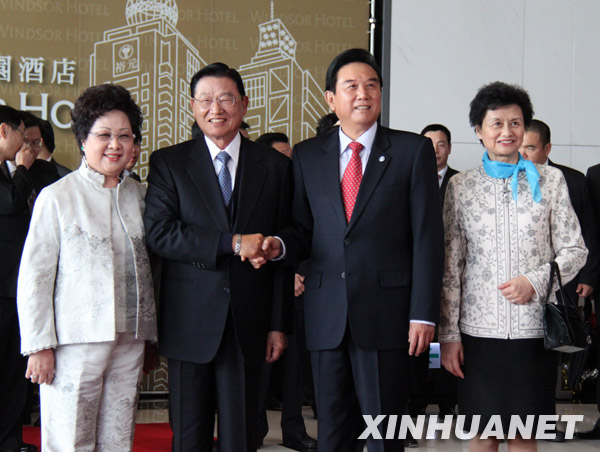 12月21日,海协会会长陈云林(前右二)抵达台中裕元花园酒店,受到海基会董事长江丙坤(前左二)的欢迎。