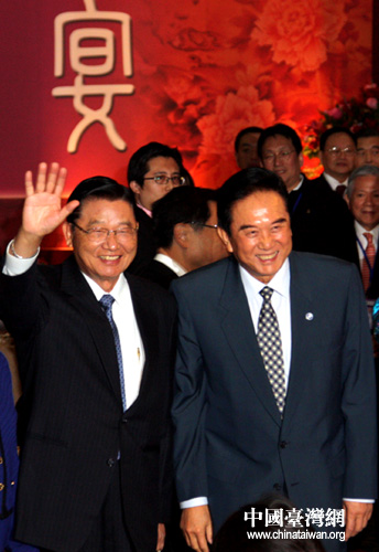21日晚间,海基会设宴款待参加两会领导人第四次会谈的海协会代表团全体成员。图为海协会会长陈云林(右)与海基会董事长江丙坤(中国台湾网 李徽 摄)