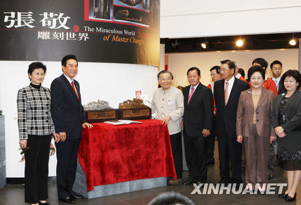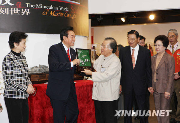 12月23日,海协会会长陈云林(左二)在参观木雕作品后与雕刻大师张敬互换纪念品。