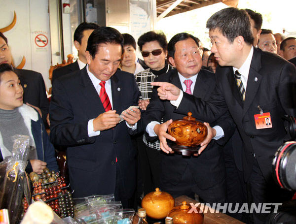 12月23日,海协会会长陈云林(前右二)在观看木雕大师制作木雕作品。新华社记者 袁满 摄