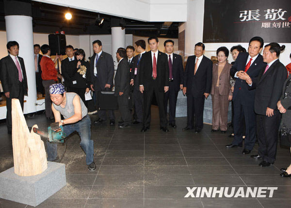 当日,刚刚结束两会第四次领导人会谈的海协会会长陈云林在海基会董事长江丙坤的陪同下,在苗栗县参观三义木雕博物馆。新华社记者 袁满 摄