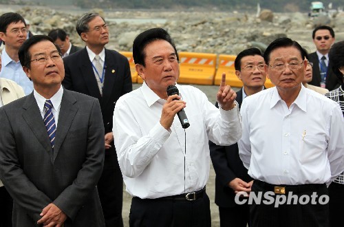 12月24日,海协会会长陈云林在海基会董事长江丙坤、南投县县长李朝卿的陪同下,探访南投水里新山村寿山桥,这里因“八八风灾”冲毁,台湾公路养护部门正在加紧修缮。陈云林说,衷心希望通过媒体向广大台湾灾区同胞转达大陆同胞对他们的深情问候和良好祝愿,祝愿他们自力更生并在外界的帮助下,早日重建家园。 中新社发 曾嘉 摄