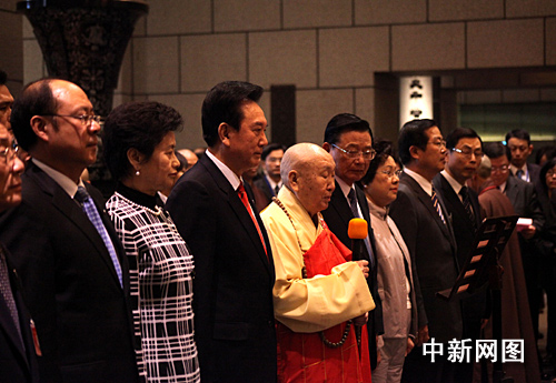 12月24日,台湾中台禅寺主持惟觉法师亲自欢迎大陆海协会会长陈云林一行到访。图为惟觉法师诵经祈求两岸和平,繁荣发展。