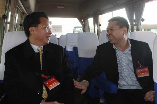 3月1日,两位来自广东省的全国政协委员、华南农业大学教授吴鸿(右)和中山大学教授刘昕在前往驻地的车上愉快交谈。 当日,广东省出席全国政协十一届二次会议的全国政协委员抵达北京。 新华社记者 刘卫兵 摄