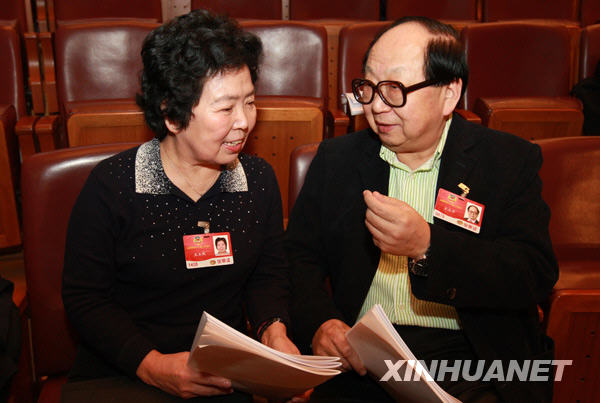 3月5日,王立平(右)和妹妹王玉凤在北京人民大会堂一起讨论有关素质教育的提案。