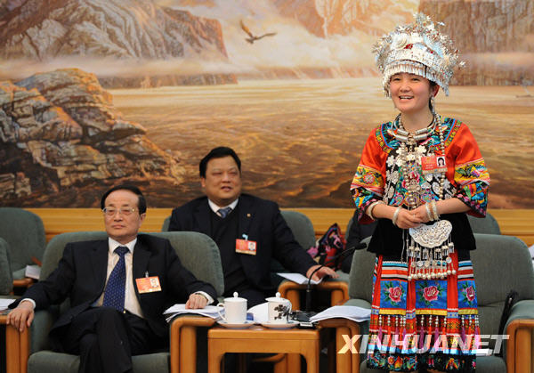 3月6日,出席十一届全国人大二次会议的重庆代表团审议政府工作报告。全国人大代表、苗族姑娘李小燕在席间唱起山歌,表达喜悦心情。新华社记者 刘建生 摄