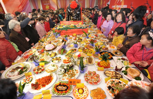 1月19日,欢聚一堂的百步亭社区居民。当天,武汉市百步亭社区举办“万家宴”,社区居民一家做一个拿手菜,两万多居民欢聚一堂,载歌载舞,一起过一个文化年。新华社记者 程敏 摄