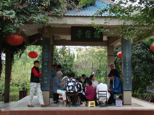 百步亭社区绿荫亭上的对联:长亭短亭亭连亭亭亭深情,党心民心心换心心心相映