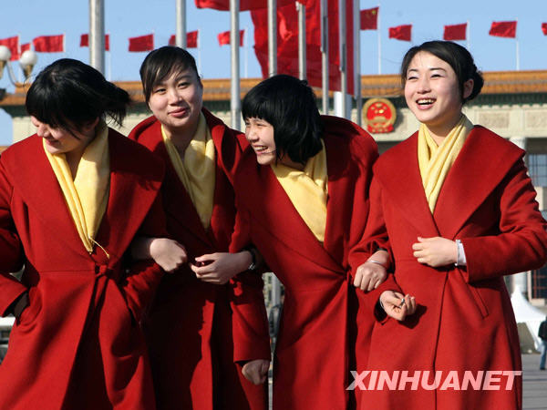 3月5日,为两会服务的工作人员在北京人民大会堂前愉快交谈。