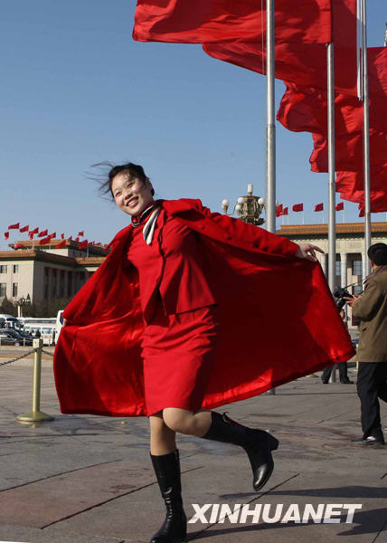 3月5日,为两会服务的工作人员在北京人民大会堂前拍照留念。新华社记者刘卫兵摄