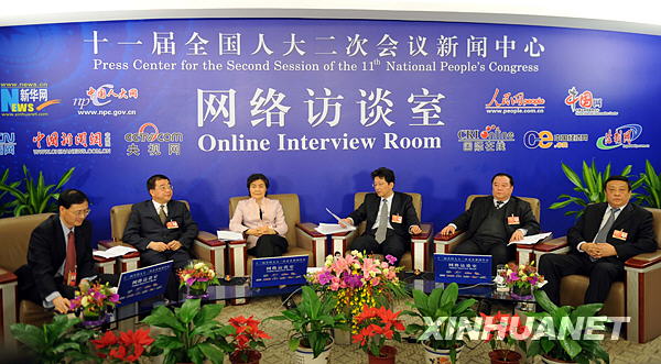 3月5日,来自重庆、广东、北京、广西、辽宁的全国人大代表杨庆育、李妙娟、张工、章远新、姜作勇(从左二至右一)来到十一届全国人大二次会议新闻中心网络访谈室,与网民在线交流,回答网民关注的经济、教育、就业等热点问题。新华社记者 杨宗友摄