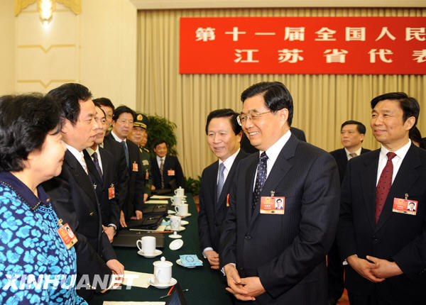 3月5日,中共中央总书记、国家主席、中央军委主席胡锦涛参加十一届全国人大二次会议江苏代表团的审议。这是胡锦涛同代表们亲切交谈。新华社记者樊如钧摄