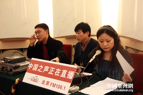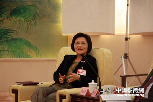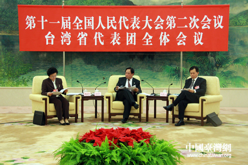 台湾省代表团在人民大会堂举行全体会议,并开放媒体采访。图为全国台联会长梁国扬代表(中),全国台联理事魏丽惠(左)和台盟中央副主席陈蔚文出席会议。
