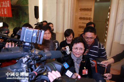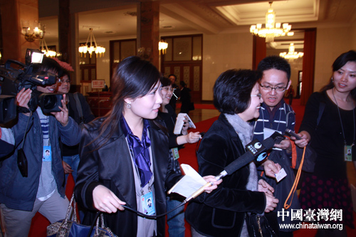 中国台湾网3月9日北京消息 出席全国人大十一届二次会议的台湾省代表团,今天下午在人民大会堂台湾厅举行全体会议,审议全国人大常委会工作报告,并开放媒体采访,回答记者提问。台湾省代表团人大代表、世界银行副行长林毅夫的夫人陈云英,在团组会后遭到热情的媒体记者“围追堵截”式采访。(图文/钟宝华)