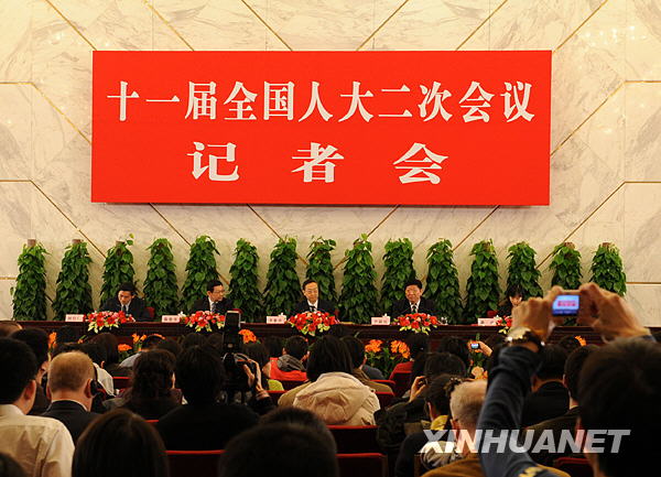 3月10日,十一届全国人大二次会议举行记者会,工业和信息化部部长李毅中、人力资源和社会保障部部长尹蔚民、商务部部长陈德铭答记者问。新华社记者陈树根摄