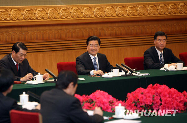 3月7日,中共中央总书记、国家主席、中央军委主席胡锦涛参加十一届全国人大二次会议广东代表团审议。这是胡锦涛同代表们共商应对国际金融危机冲击、推动经济发展、促进社会和谐稳定大计。新华社记者兰红光摄