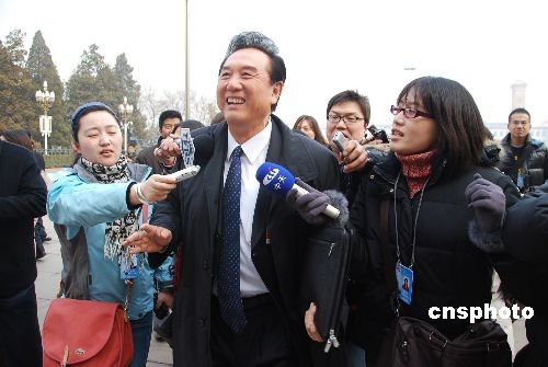 3月3日下午,海峡两岸关系协会会长陈云林在人民大会堂前接受媒体采访。 中新社发 韩海冰 摄