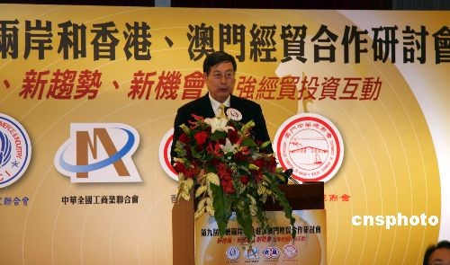 2月18日,第九届海峡两岸和香港、澳门经贸合作研讨会在台北亚太会馆举行。图为中华全国工商联主席黄孟复在会上致辞。 中新社发 陈立宇 摄