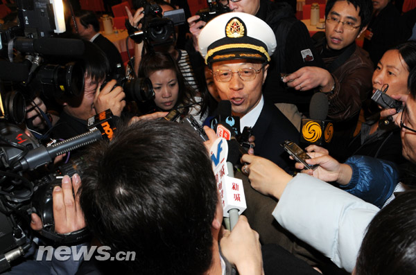3月10日,十一届全国人民代表大会第二次会议在人民大会堂举行第三次全体会议,听取最高人民法院院长王胜俊作最高人民法院工作报告;听取最高人民检察院检察长曹建明作最高人民检察院工作报告。图为一位解放军代表在当天会议休会离开时被媒体“包围”采访。文涛 摄