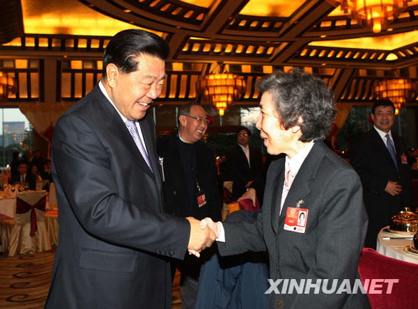 3月9日晚,全国政协办公厅、中央统战部在北京钓鱼台国宾馆举行招待会,招待出席全国政协十一届二次会议的香港特别行政区和澳门特别行政区全国政协委员。中共中央政治局常委、全国政协主席贾庆林出席。这是贾庆林与伍淑清委员亲切握手。新华社记者刘卫兵摄
