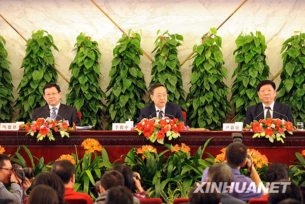 3月10日,十一届全国人大二次会议举行记者会,工业和信息化部部长李毅中、人力资源和社会保障部部长尹蔚民、商务部部长陈德铭答记者问。新华社记者陈树根摄
