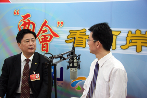 台籍代表何大欣接受中国国际广播电台海峡飞虹和中国台湾网联合制作的“两会看两岸”节目访谈。
