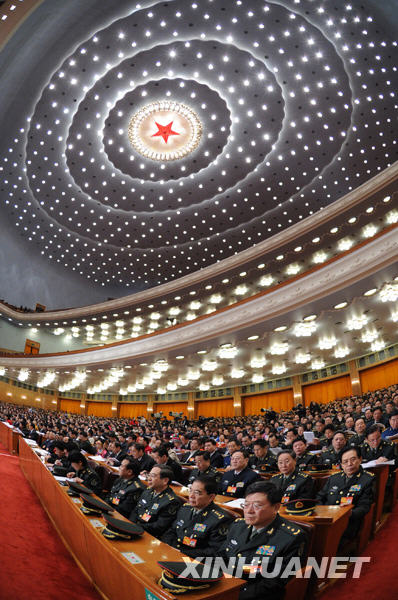 3月8日,十一届全国人大三次会议在北京人民大会堂举行第二次全体会议,听取全国人大常委会副委员长王兆国关于中华人民共和国全国人民代表大会和地方各级人民代表大会选举法修正案草案的说明。这是大会会场。新华社记者饶爱民摄