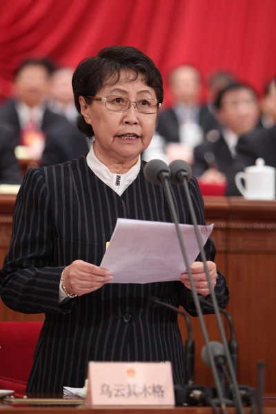 3月8日,十一届全国人大三次会议在北京人民大会堂举行第二次全体会议,听取全国人大常委会副委员长王兆国关于中华人民共和国全国人民代表大会和地方各级人民代表大会选举法修正案草案的说明。这是乌云其木格主持会议。新华社记者鞠鹏摄