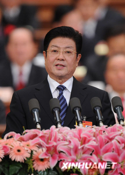 3月8日,十一届全国人大三次会议在北京人民大会堂举行第二次全体会议。受全国人大常委会委托,全国人大常委会副委员长王兆国向大会作关于选举法修正案草案的说明。新华社记者饶爱民摄