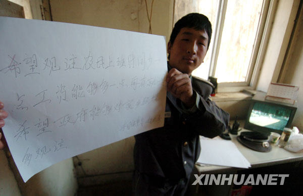 3月9日,在北京一单位门卫室内,来自甘肃的赵永康说,希望代表、委员们能够关注农民工的工作时间长和工资待遇问题;希望关注他们家乡的环境问题。