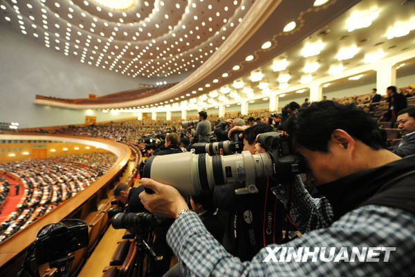 3月14日,第十一届全国人民代表大会第三次会议在北京人民大会堂举行闭幕会。这是摄影记者在现场采访。 新华社记者 杨宗友 摄