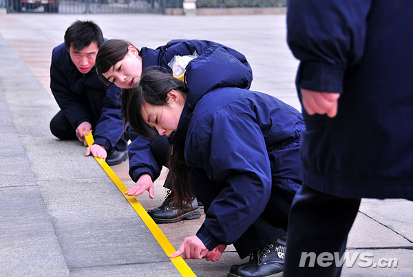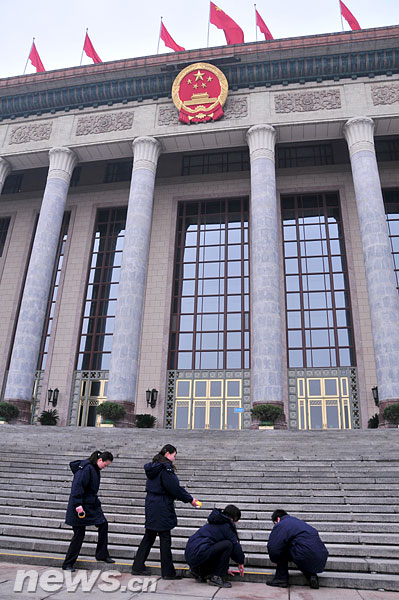 新华网3月3日电(记者刘军、翟子赫)记者3日中午在人民大会堂东门前发现,一队工作人员竟然人人蹲在地上,手里都拿着一卷黄色的胶带,面对脚下的台阶似乎在比划商量着什么。
