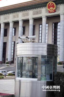人民大会堂前的治安岗亭装上了摄像头。 (中国台湾网发 肖春阳、刘洋摄影报道)