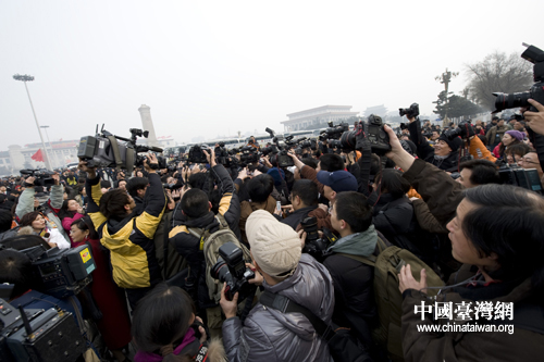 政协会开幕式刘翔成为记者围堵的热点,由于去年政协会上很多记者苦苦没有等到刘翔的身影,当3月3日下午政协会开幕前刘翔一出现时,就被记者围得里三层外三层,慌乱中有的记者还被踩掉了鞋子。(中国台湾网发 肖春阳、刘洋摄影报道)