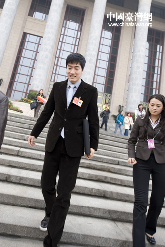 政协开幕式结束后,当大多数记者已经散去,刘翔才从人民大会堂东门记者通道小心走出来。(中国台湾网发 肖春阳、刘洋摄影报道)