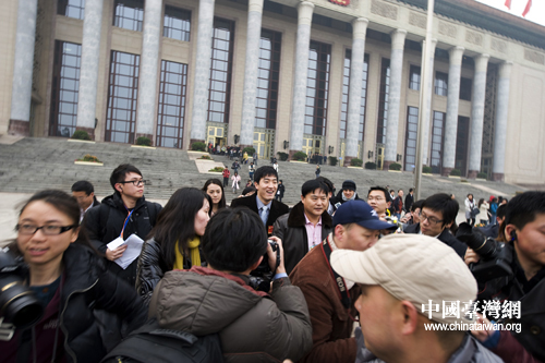 少数有心的记者还是发现了他,当问及今年有何提案时,刘翔未答,在人民大会堂东侧广场呈现出几十名记者追逐刘翔的画面。(中国台湾网发 肖春阳、刘洋摄影报道)