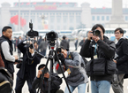 来自美联社的记者在人民大会堂前支起了脚架,一人控制三台相机不停拍摄,引起同行关注。(中国台湾网发 肖春阳、刘洋摄)