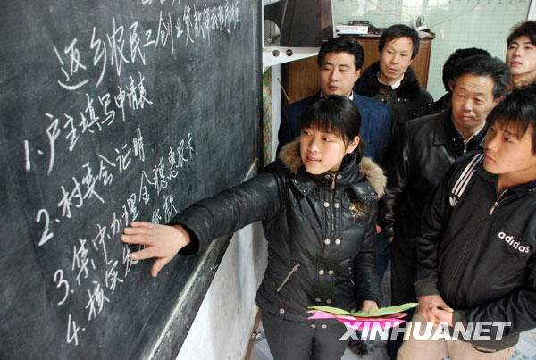 2009年3月1日,河南省汤阴县白营乡后湾张村大学生村官郑芳芳正在向村里的返乡农民工讲解县农行小额创业贷款申报程序。为帮助返乡农民工和农村富余劳动力就业,河南省汤阴县大力实施农民“三户联保”创业信贷工程,以小额信贷的方式,帮助农民工就业创业。新华社发