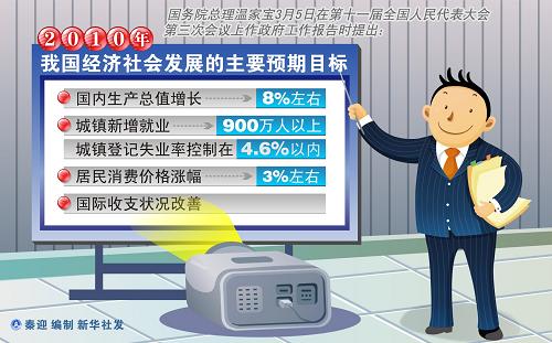 新华网北京3月5日电 中国国务院总理温家宝5日在十一届全国人大三次会议上所作的政府工作报告中,提出了2010年中国经济的10个关键数据: