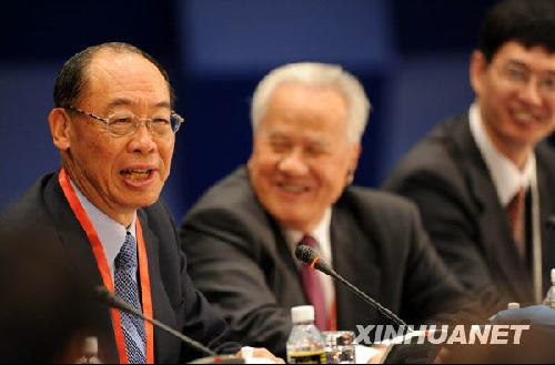 4月19日,台湾两岸共同市场基金会最高顾问钱复(左)和中国企业联合会名誉会长、博鳌亚洲论坛首席顾问陈锦华(中)共同主持“国际金融危机与两岸金融合作”圆桌会议。“国际金融危机与两岸金融合作”圆桌会议当日在博鳌亚洲论坛2009年年会上举行。与会的两岸金融界、产业界、学术界30名嘉宾,就两岸为因应危机而采取的各种金融政策措施交换了看法,并就加强两岸金融合作等问题进行了深入探讨。(图片来源:新华社)