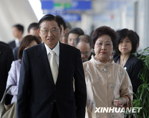 4月29日,江丙坤(左)和夫人陈美惠准备登机返台。当日,由台湾海基会董事长江丙坤率领的海基会协商代表团从上海浦东国际机场启程返回台湾。新华社记者邢广利 摄