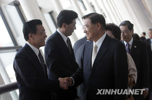 4月29日,江丙坤(右)与前来送行的海协会驻会副会长李炳才握手道别。新华社记者邢广利 摄