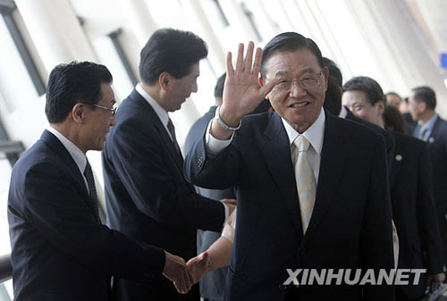 4月29日,江丙坤向送行人们挥手致意。新华社记者邢广利 摄