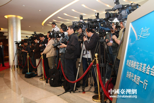 中国台湾网4月25日南京消息 出席第三次“陈江会谈”的海基会董事长江丙坤一行,预计将在今天上午11时50分左右抵达此次会谈所在地——南京紫金山庄,海协会会长陈云林及相关人员将在紫金山庄主楼大堂迎接。 本次会谈吸引了两岸四地及海外的98家媒体260余名记者云集南京,图为在紫金山庄主楼大堂驻守等待的媒体大军。(记者 李徽 钟宝华)