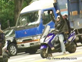 陈水扁陪绿营“立委”参选人在台北市扫街拜票,坐在摩托车上的骑士比出倒扁手势。(东森新闻图)